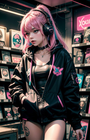 Pretty girl with colorful hair in black leather clothes and headphones standing in a gaming shop.