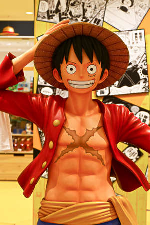 Osaka, Japan - Aug 25, 2020 : Photo of Statue of Monkey D.Luffy from Japanese manga and animation One Piece in Osaka. Luffy is the leader of a Straw hat pirate team.