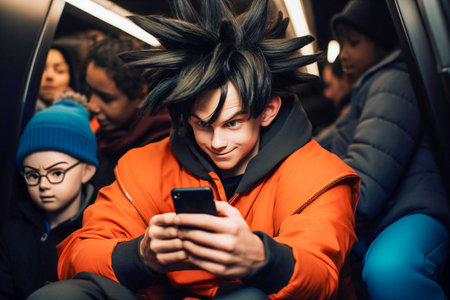 An AI-generated illustration of A young man in a car looking at his phone while other people can be seen through the car window