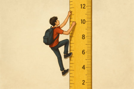 Young student climbing a giant ruler, symbolizing personal growth, achieving goals and the pursuit of knowledge