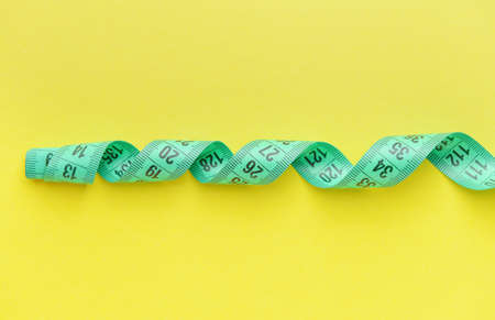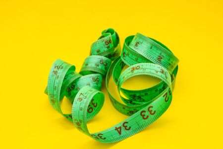 Dieting symbol of yellow measuring tape on green background.Yellow measuring tape.