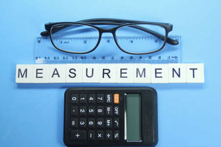 glasses, rulers and calculators with the word measurement. measurement concept