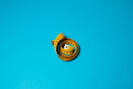 Weight loss concept with yellow centimeter isolated on blue background with advertising area