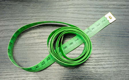 Green plastic tape measure (metric) for applications in tailoring on the table. View from above.