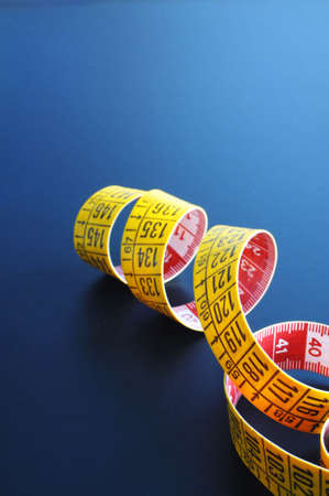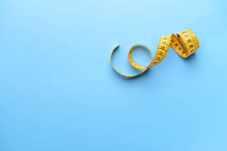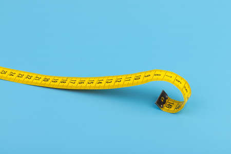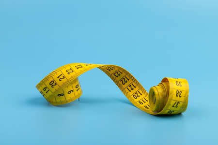 Yellow measuring tape on a blue background. The concept of diet and weight loss.