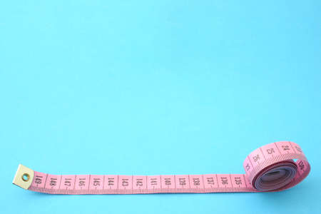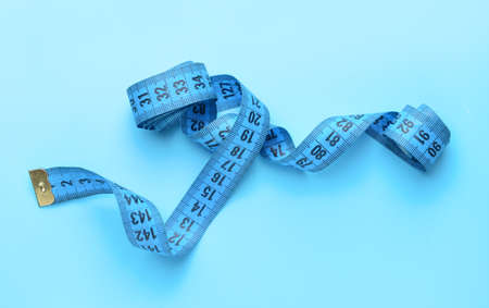 Roll of blue tape measure untwisted on turquoise background with copy space as symbol of weight management