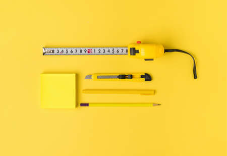 Measuring tape, pen, pencil, knife and paper on a yellow background. Monochrome image of office supplies. flat lay.