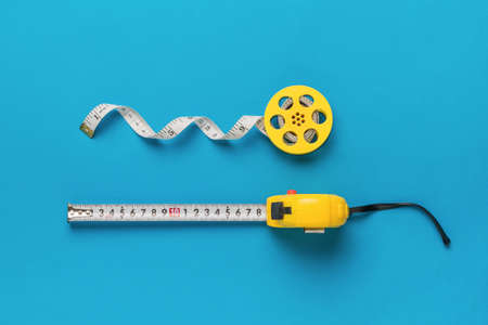 Two yellow measuring tapes on a blue background. Minimal concept of measuring instruments. flat lay.