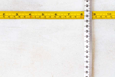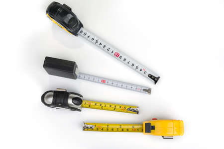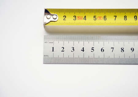 Metal ruler and Tape measure, centimeters and millimeters on the yellow ruler. Sizes on the white background