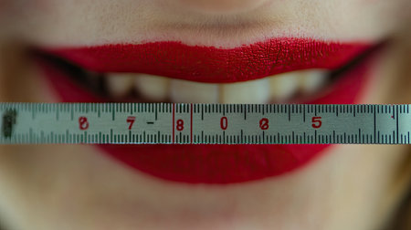 This captivating close-up features vibrant red lips smiling with a measuring tape placed across the teeth, symbolizing beauty and confidence in fashion.