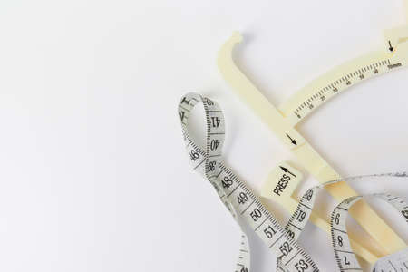 A caliper and measuring tape on white background with copy space, weightloss and dieting slimming programs for sport shape concept