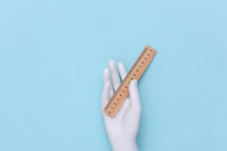 White mannequin hand holding wooden school ruler on blue pastel background.