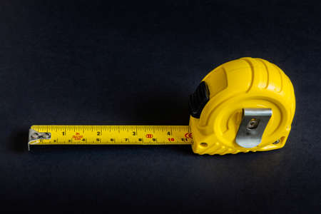 Yellow ruler tool on black rope cable for measuring objects with precision. Work centimeter equipment instrument for lenght accuracy