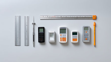 This image showcases an organized collection of precision measuring tools and calculators, ideal for educational or technical projects. Perfect for professionals and students.