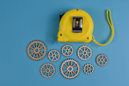 Yellow tape measure and six wooden gears on blue surface represent precision, measurement, and mechanical design in engineering or construction contexts.