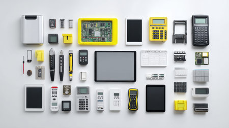 Various small electronic devices are organized methodically on a clean white surface, showing their design and functionality.