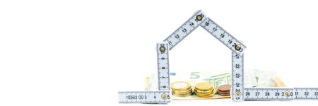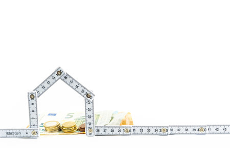 Folded folding rule in the shape of a house, behind it bills and coins