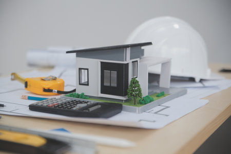 Closeup image of skilled professional engineer hand using ruler measures house model on table with blurred background. Creative design, architect design, architectural equipment concept. Immaculate.