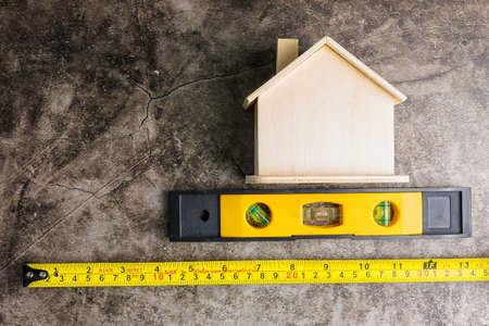 Wooden white house toy and construction tools on Gray-black cement floor background with copy space.Real estate concept, New house.Home repair concept