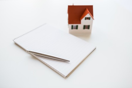 building, mortgage, real estate and property concept - close up of house model, notebook and pencil