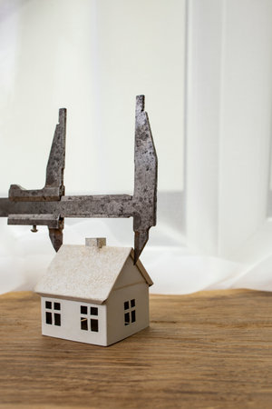 Metal caliper measuring a white model house on a wooden desk, construction cost concept