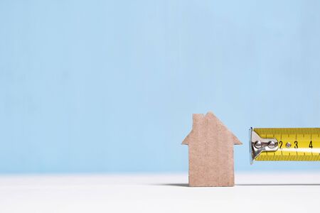 Metal measuring tape and cardboard cutout house on blue background with copy space. Concept of surveying, budgeting, repairing.