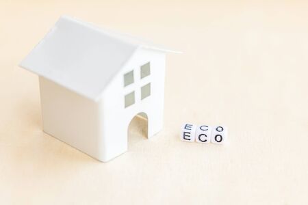 Miniature toy model house with inscription ECO letters word on wooden backdrop. Eco Village abstract environmental background. Ecology zero waste social responsibility recycle bio home concept