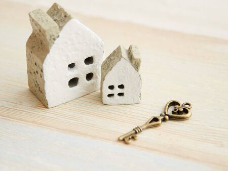 Key house with tag text home sweet home on wood background.