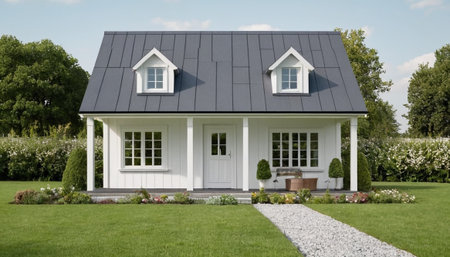 Black and White Cottage with White Fence and Path