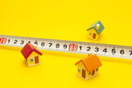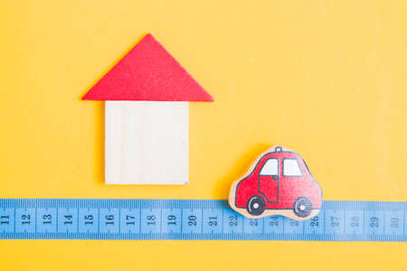 wooden house made of trugolnik and square and next to it is a toy red car, measuring tape on a yellow background, social distance concept, krantin and pandemic 2020