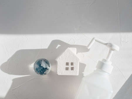 Home, earth and disinfectant. Image of preventive measures against new coronavirus (COVID-19) and infectious diseases.