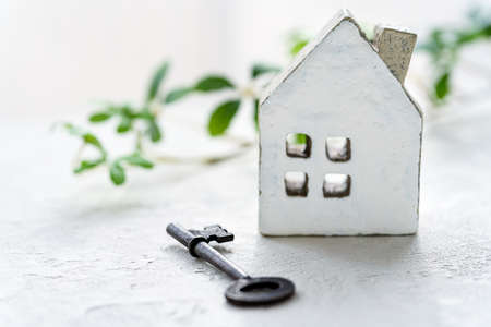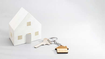 A keychain in the form of a white house and a small metal key on a black background. The concept of buying, selling, renting real estate, mortgages, neighbors, your home