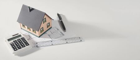 Buying your own home, home loan concept. House model and office supplies. Wide image background with copy space