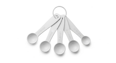 A set of five white plastic measuring spoons of varying sizes are neatly arranged on a white surface with soft shadows.