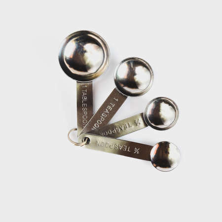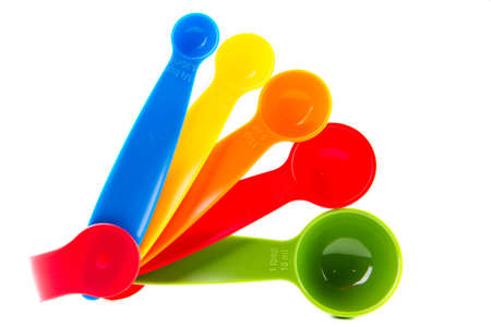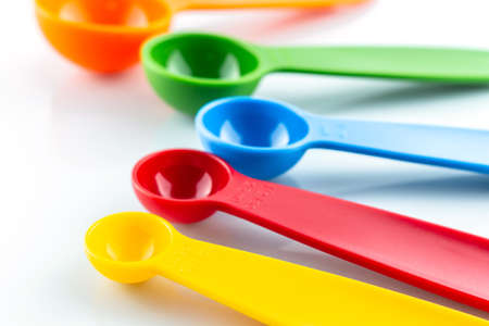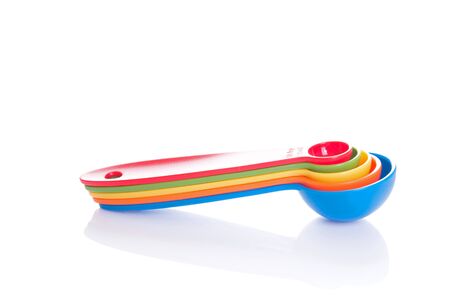 Studio picture of a small set of chromatic measuring spoons, kitchen equipment.