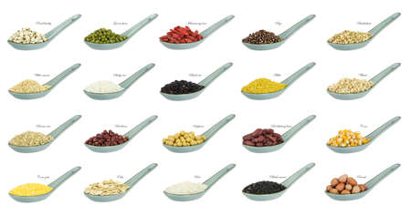 raw variety bean and cereal plant in measuring spoon on wooden table
