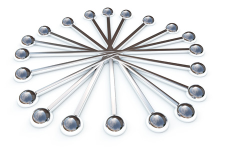 A neat arrangement of silver spoons on a white background showcases simple elegance and modern design, ideal for culinary or kitchen-related themes.