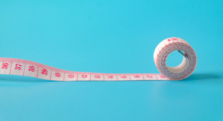 Weight loss concept with yellow centimeter isolated on blue background with advertising area