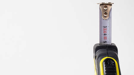Measuring roulette yellow black on a white background banner with space for text. A construction tool