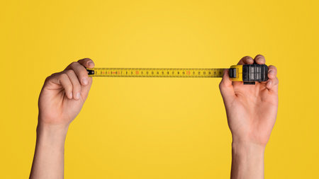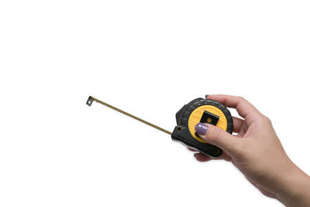 The person is using the length meter, tool for measuring length, Isolated on yellow background