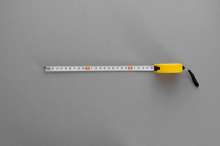 Top view of industrial measuring tape on yellow background, panoramic shot