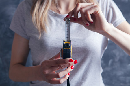 Measure it, a yellow construction tape measure to measure the length of something. Roulette with a measured segment in a female hand, blue background