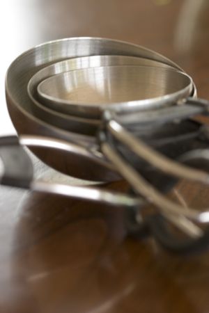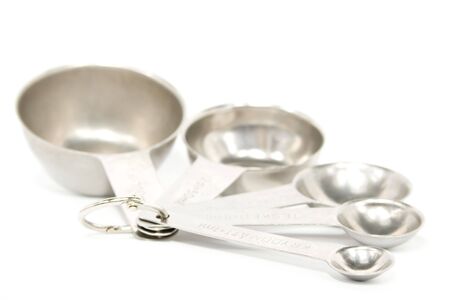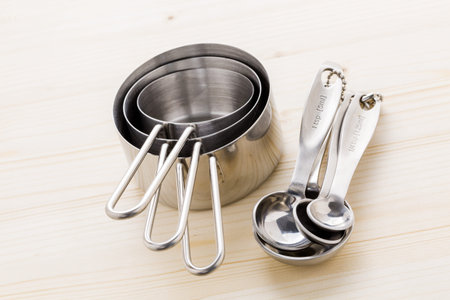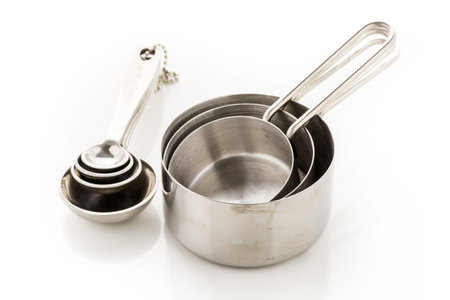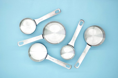 Collection of stainless measuring cups and measuring spoon with a napkin in top view