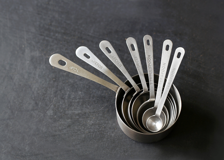 Measuring spoons, several sizes of spoons in the same set, top view of measuring spoons, 1 Tbsp, 1/2 Tbsp, 1 Tsp, 1/2 Tsp, 1/4 Tsp.
