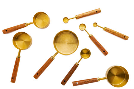 Copper measuring cups on marble table in the kitchen. Ready to cook or bulk food purchase concept