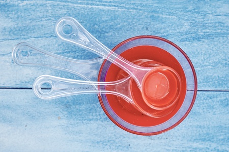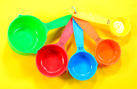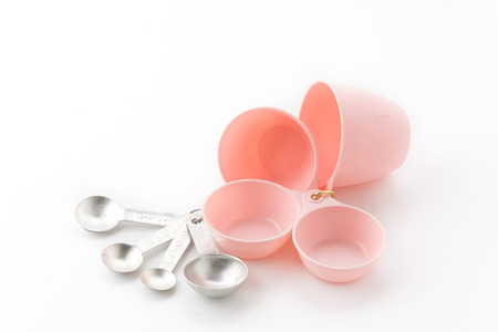Kitchen colorful plastic measuring spoons on a white background. Close up view.