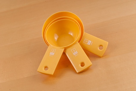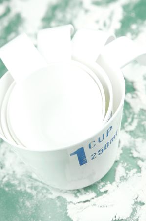 Set of measuring cups, measuring spoons and plastic cookie cutters use in cooking lay on marble tabletop
