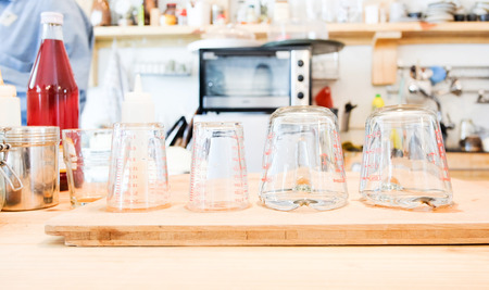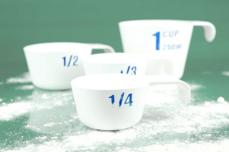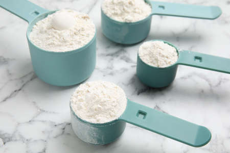 colorful measuring cups with flour on wooden table. Concept of cooking and kitchen tools