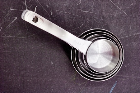A Kitchen set of 6 silver measuring cups are nested inside each other on a black chalkboard background.