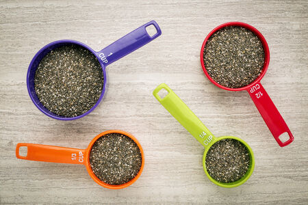 chia seeds in colorful, plastic, measuring cups against ceramic tile background - top view